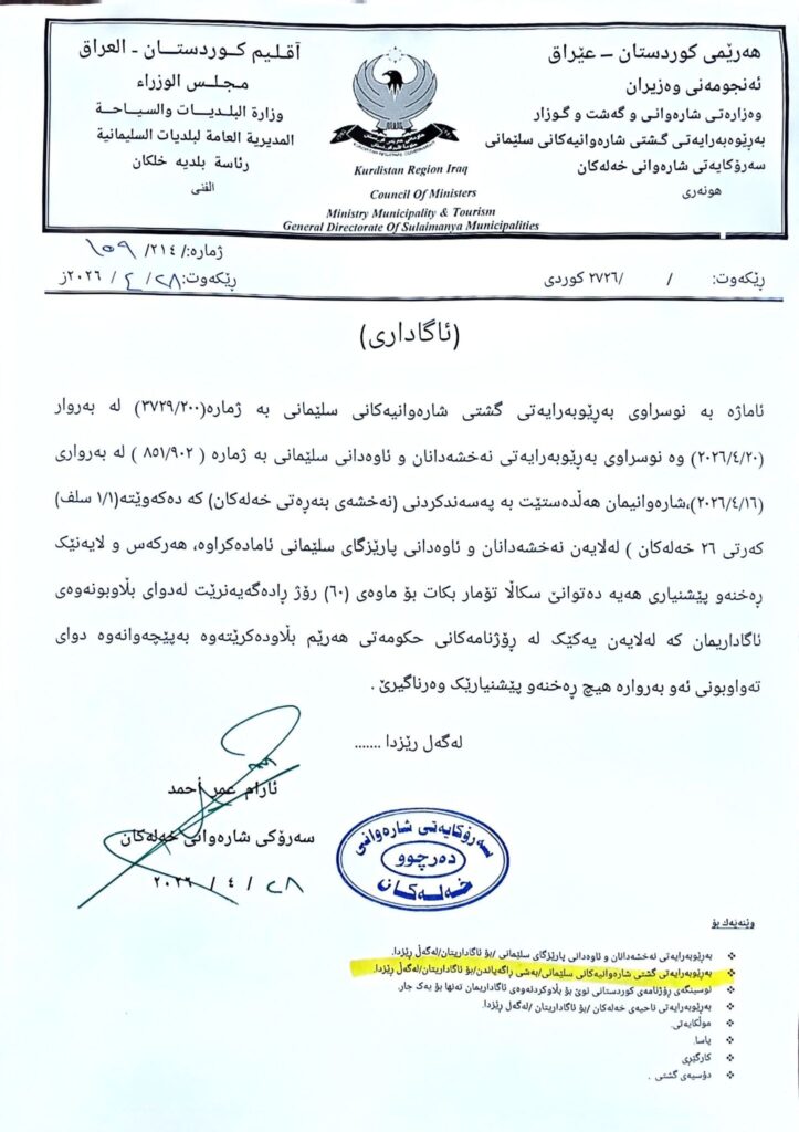 ئاگاداری لە شارەوانی خەلەکانەوە
